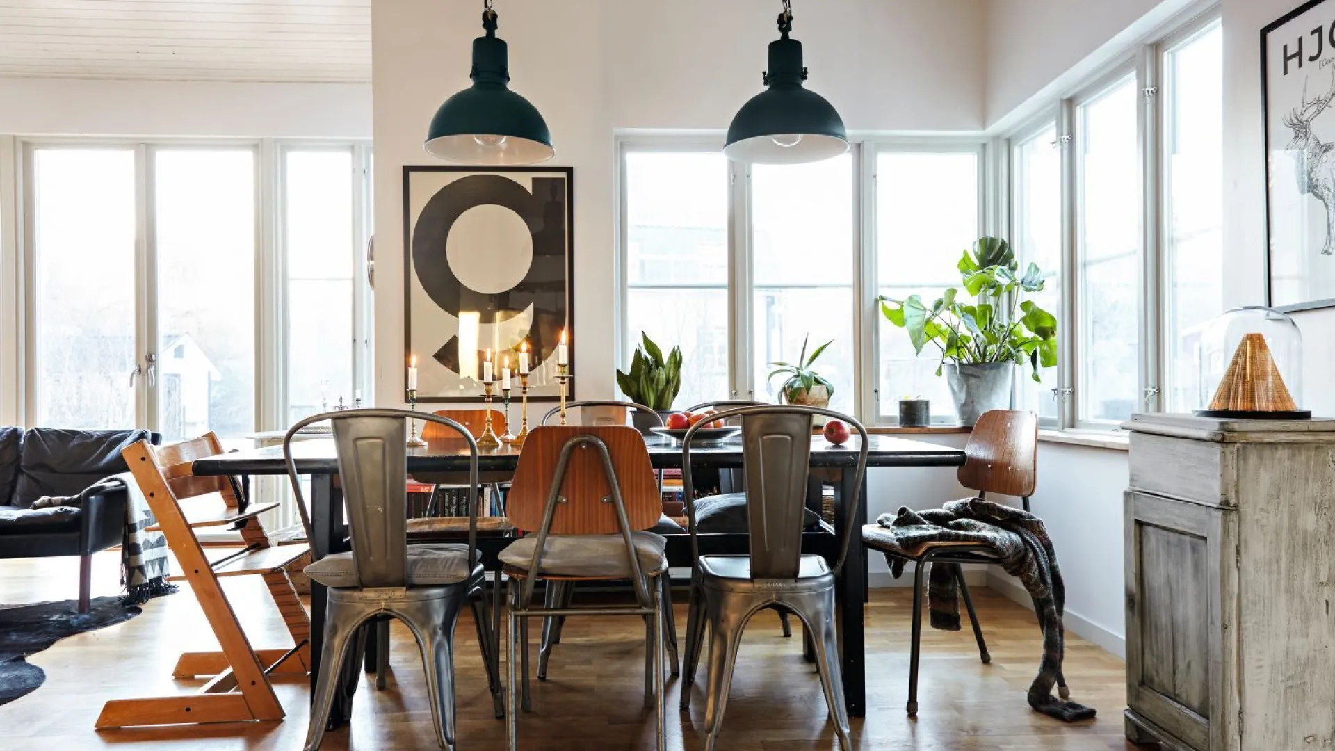 Det store spisebordet har familien fått av Eriks foreldre. Josefin har malt bordet i høyblank svart. Når det blir slitt, fyller hun på med ny maling så det stadig ser ut som nytt. Rundt spisebordet forenes Tolix-stoler, datterens Tripp Trapp-stol og stoler i formpresset tre med stålbein.