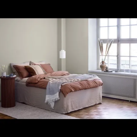 Her har vi valgt å male veggene til skjøten i den milde grønne Mistel 800. Den bryter fint til lys Kokos 502 som kan dekke overkanten av veggene. De to kaffebordene er malt i Elefant 553 og Hav 760, som sammen med andre naturlige toner på møbler og tekstiler skaper en fin helhet i rommet.