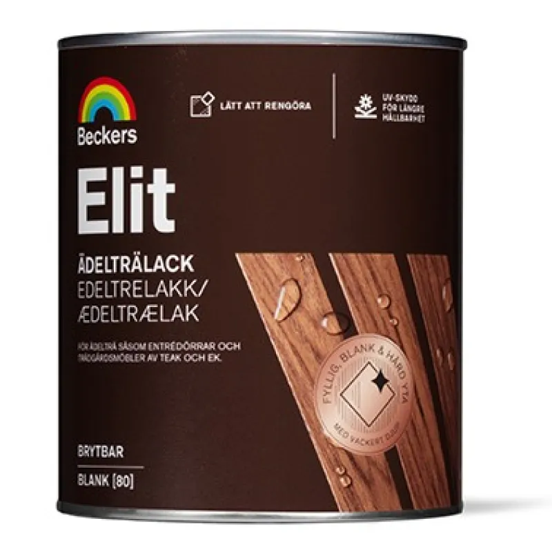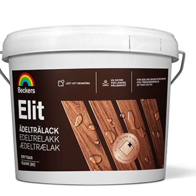 Beckers Elit Edeltrelakk er en blank klarlakk som brukes for å lakkere edeltre som teak og eik. Lakken kan med fordel brukes på inngangsdører, hagemøbler og andre dører, lister og panel utendørs. Lakken har en svak bruk pigment som gir en fyldig, blank og vannavstøtende overflate med en lekker dybde. I tillegg er den forsterket med UV-beskyttelse for lengre holdbarhet.