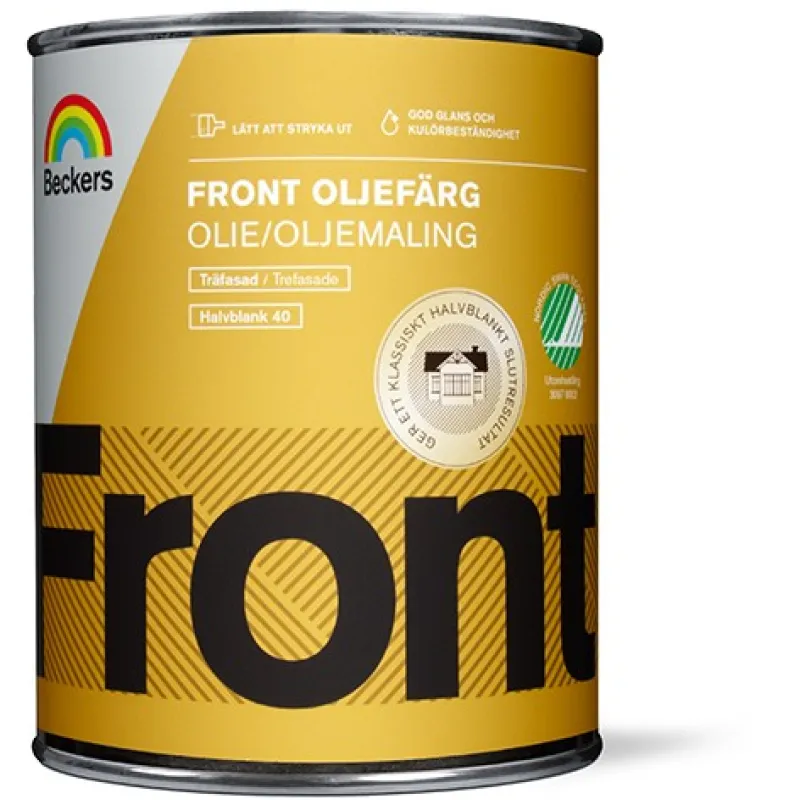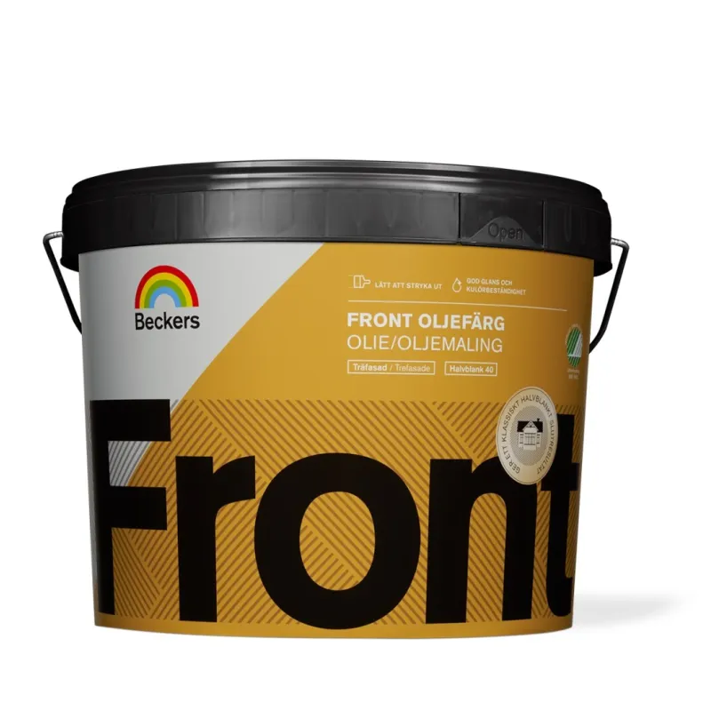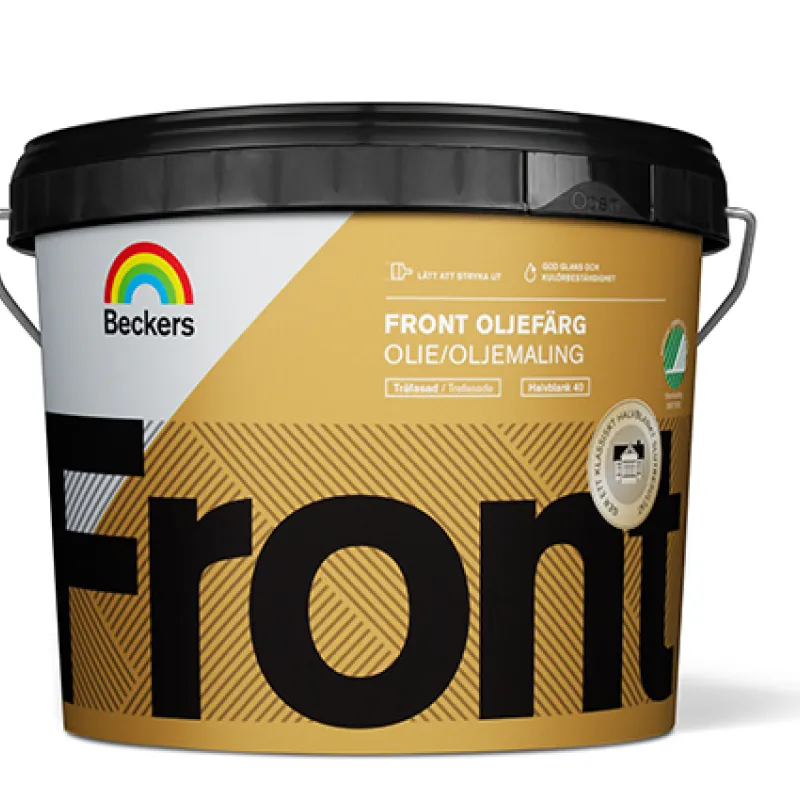Beckers Front Oljemaling er en klassisk maling til trefasader. Malingen er lett å stryke ut og renner ikke. Front Oljemaling gir et fint, halvblankt sluttresultat og passer også godt til gjerder, vindskier, dører og lignende. Bruk Front Oljemaling sammen med Primex Grunnolje Pluss og Primex Tregrunn Pluss for et lekkert, holdbart resultat.