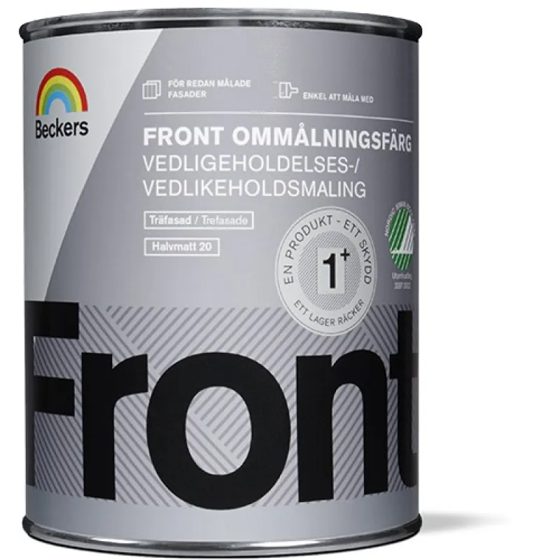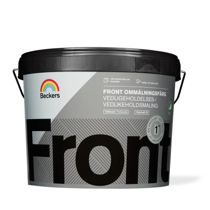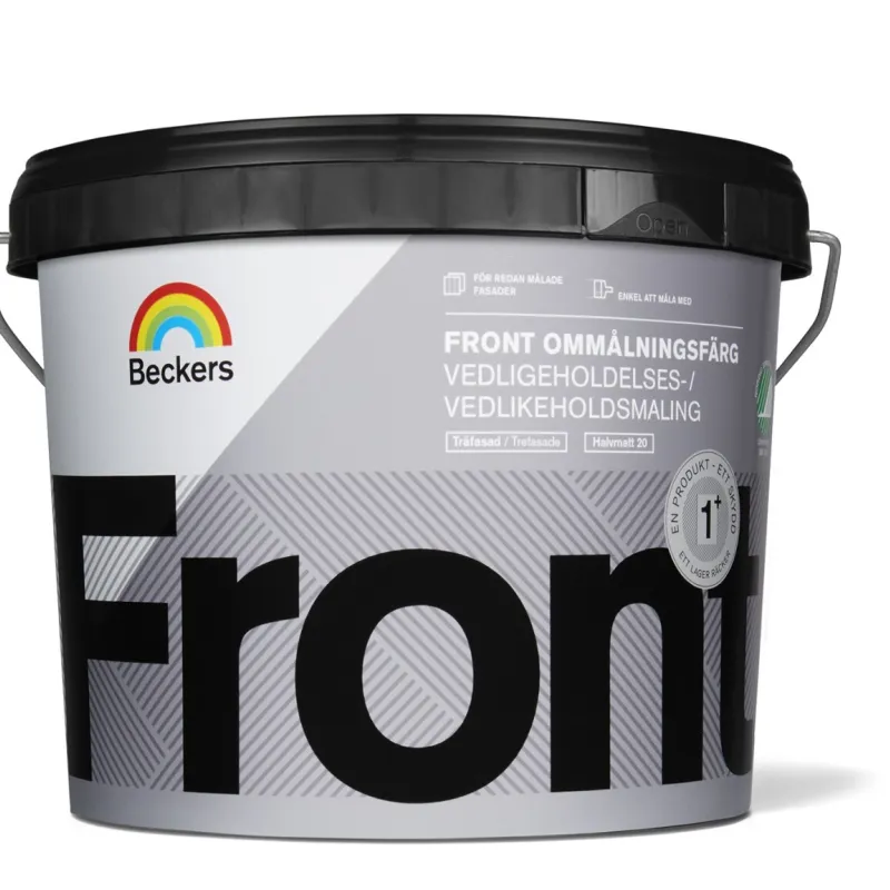 Rør malingen godt før bruk! Overflaten skal være tørr, maks 16% fukt. Mal ikke på solvarme overflater. Mal heller ikke hvis det er risiko for regn eller dugg innenfor 1-2 timer etter at malingen er avsluttet. Hvis det er store flater som ikke er tidligere behandlet, anbefales et annet Beckers malingssystemer. Det samme gjelder for industrigrunnet kledning. For mere informasjon, kontakt din fargehandler. Front Vedlikeholdsmaling skal ikke brukes på overflater som tidligere er behandlet med beis, linoljemaling eller slammaling. OBS! Front Vedlikeholdsmaling skal ikke tynnes. Vi anbefaler heller ikke bruk av sprøyte. Besøk vår hjemmeside www.beckers.no for ytterligere informasjon.