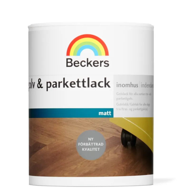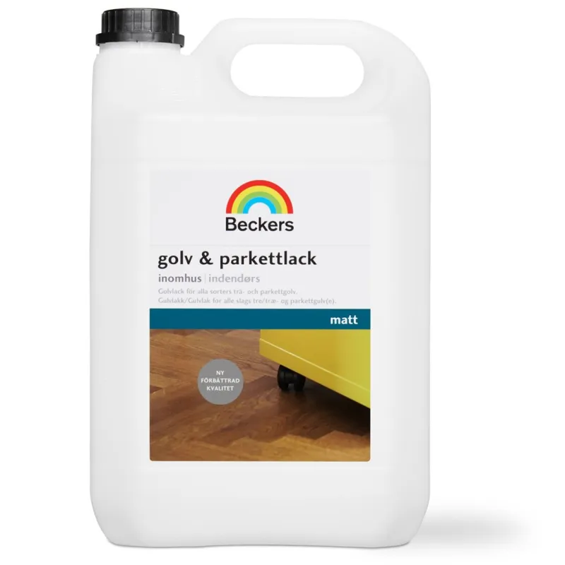 Beckers Gulv- og Parkettlakk Matt er en vanntynnbar klarlakk som brukes til å behandle alle typer tre- og parkettgulv innendørs. Den matte klarlakken brukes også på gulv som tidligere har blitt malt med Gulvmaling Betong. Bevar tregulvet fint lenger – med Gulv- og Parkettlakk beskytter du treet og får en slitesterk og vaskbar overflate.
