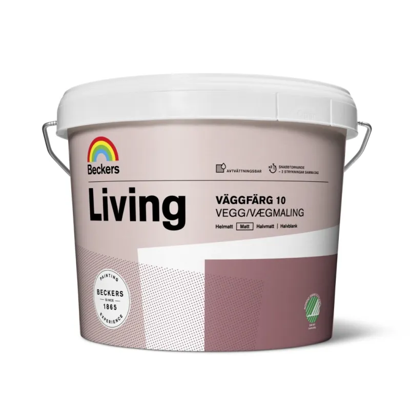 Living Veggmaling 10 er en matt vannfortynnbar akrylmaling med høy dekkevne. Den gir en vaskbar, matt overflate som er velegnet som overflater i soverom og hverdagsrom.