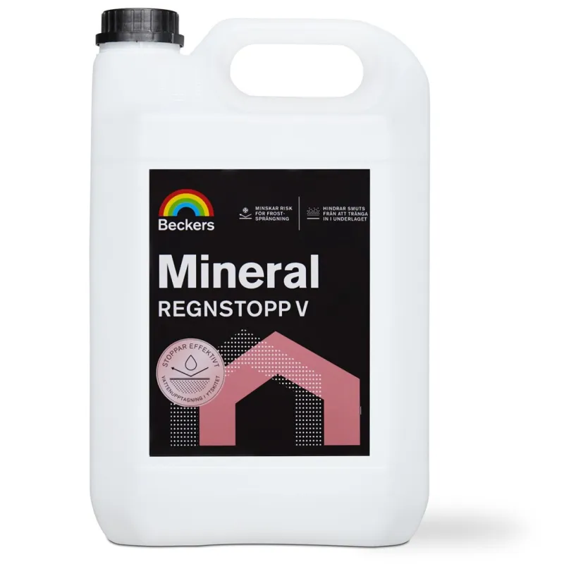 God beskyttelse mot vann lønner seg på sikt. Beckers Mineral Regnstopp V er et impregneringsmiddel som effektivt stopper overflatens evne til å absorbere vann når det regner, og lar fasaden puste ut vanndamp. Ved hjelp av Mineral Regnstopp V reduseres risikoen for frostsprengning og det blir lettere å rengjøre overflaten ettersom det blir vanskeligere for smuss å trenge gjennom overflaten. Bruk Mineral Regnstopp V på ubehandlede absorberende mineraloverflater av for eksempel puss, betong eller murstein.