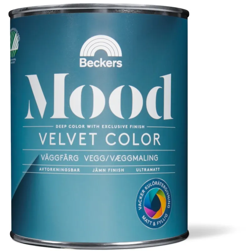 Mood Velvet Color er en ultramatt veggmaling som passer i rom der man ønsker et eksklusivt sluttresultat. Malingen gjengir farger svært godt og gir derfor spesielt en vakker fargedybde til mørke eller dype farger. Mood Velvet Color gir en jevn og avtørkbar overflate uten sjenerende reflekser.