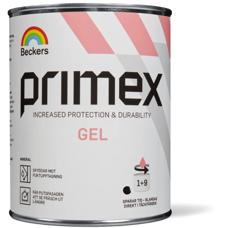 Få malingen til å vare lenger på pussfasaden. Beckers Primex Gel er en primer som brukes til å grunne mineraloverflater ved å blande den i Kivisil Fasademaling, Pussmaling, Betongbeskyttelsesmaling eller Novasil i første strøk. Med Primex Gel går den grunnleggende jobben raskere takket være at den blandes direkte i dekkmalingen - på denne måten unngår du grunning av underlaget, før du går på det siste strøket med dekkmalingen. Bruk Becker's Primer Gel hvis du vil ha et langvarig resultat.