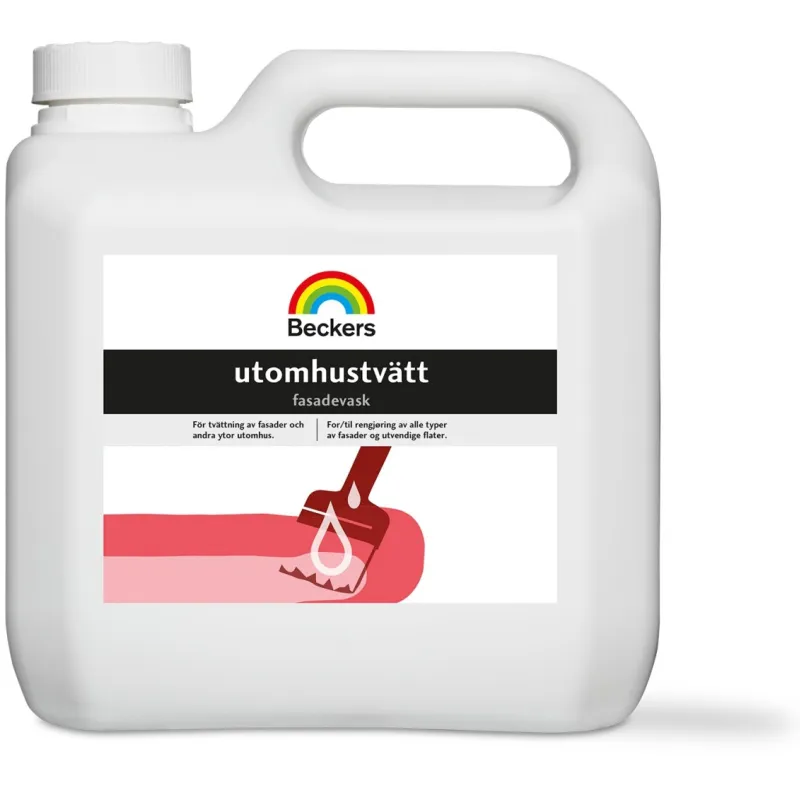 Beckers Utendørsvask er et effektivt rengjøringsmiddel som løsner fett, skitt, sot og lettere angrep av alger og mugg. Beckers Utendørsvask kan brukes på alle typer overflater utendørs. Produktet kan både brukes til løpende vedlikehold og til rengjøring før maling, se blandingsforhold. Med vedlikeholdsrengjøring blir overflatene rene og opprettholder glansen. Ved rengjøring før maling blir overflaten matt for bedre feste. Malingen holder lenger når huset er rent, så vedlikehold fasaden med Beckers Utendørsvask.