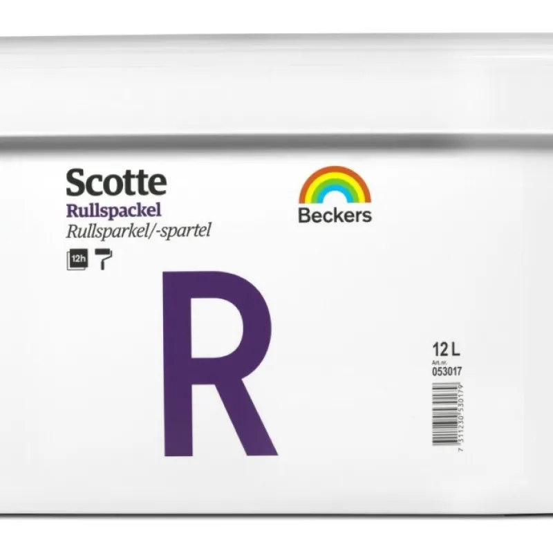 Scotte R er en finkornet, lett rullesparkel med god fyllevne til skjøter-, flekk- og helsparkling innendørs. Den smidige konsistensen gjør sparkelen lett å påføre og fordele på overflaten med rulle. Scotte R kan brukes på de fleste innendørs overflater som gips, betong, puss, glassfiberduk etc i tørre rom. Scotte R sparer tid og krefter fordi den er enkel å jobbe med fra et ergonomisk synspunkt. Hvis du vil ha en ekstra glatt overflate før du maler eller tapetserer, skal du sparkle med Scotte R. Sparkelen er ferdigblandet. Det er bare å åpne lokket og begynne å rulle.